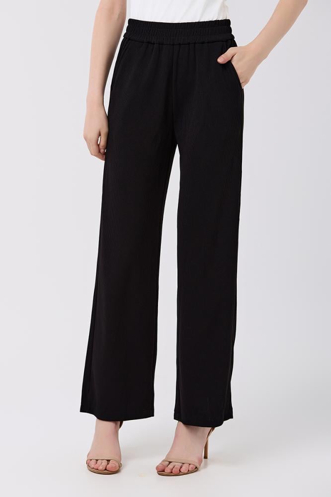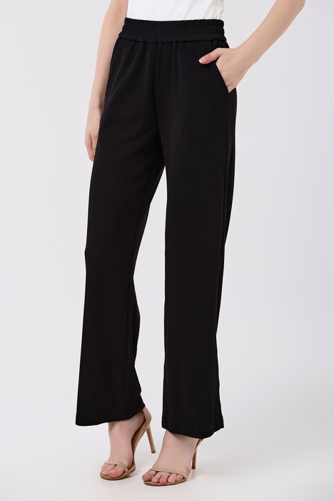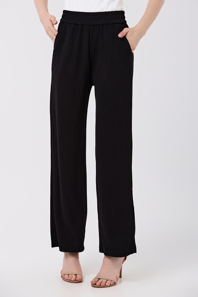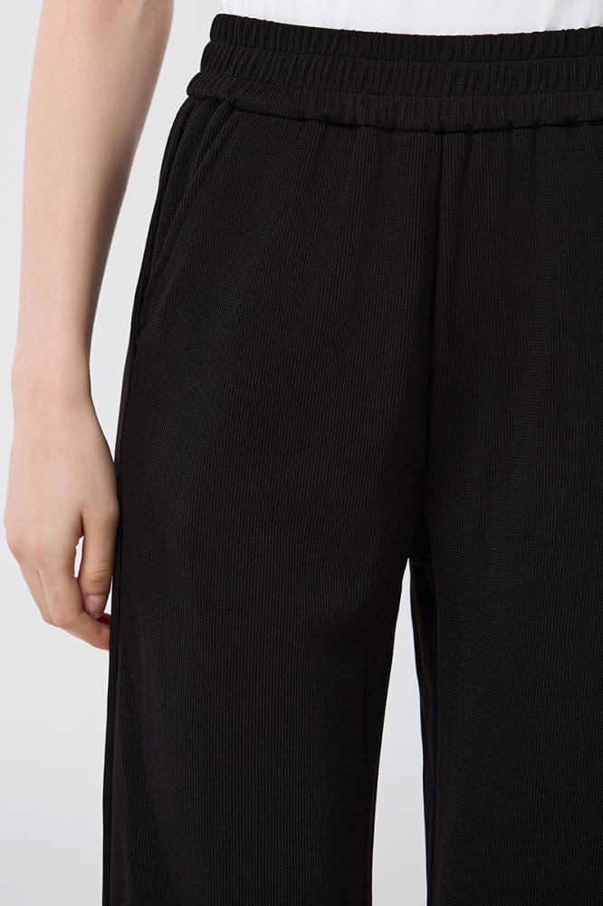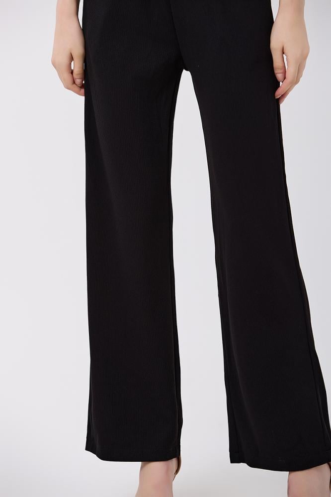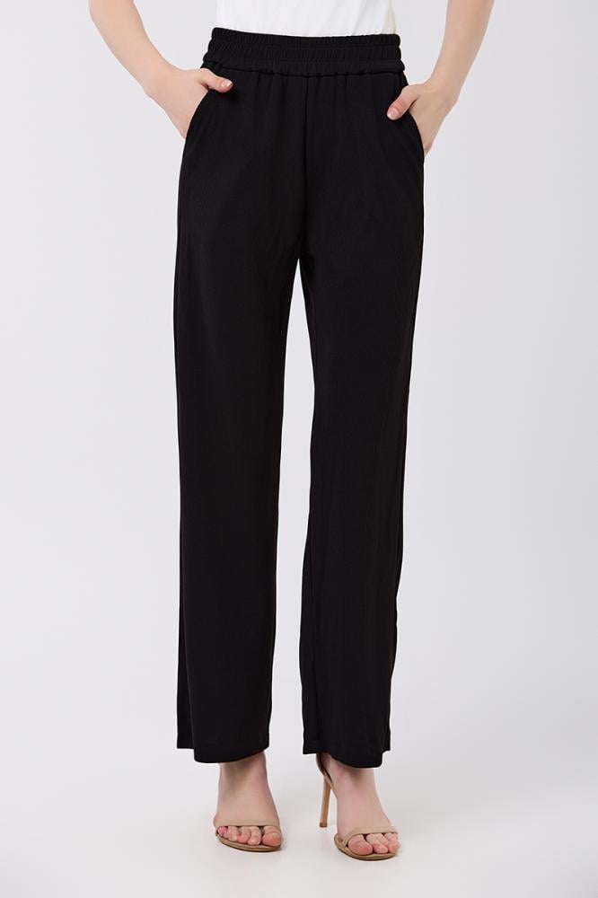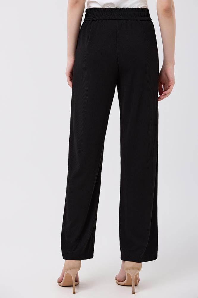 بنطال كريب استرتش اسود بقصة واسعة ومريحة مع خصر مغاط