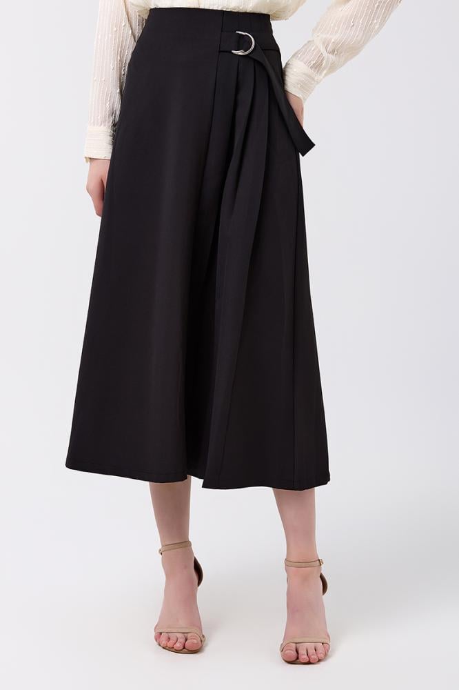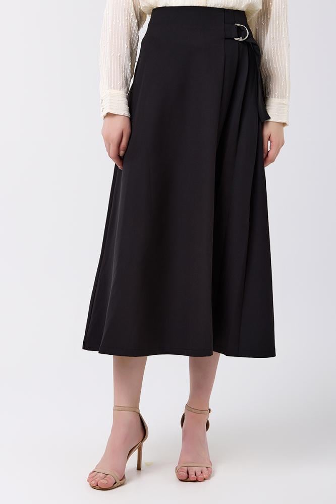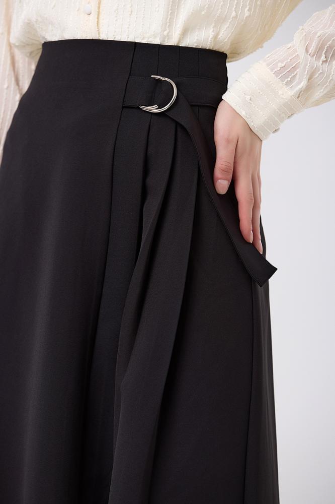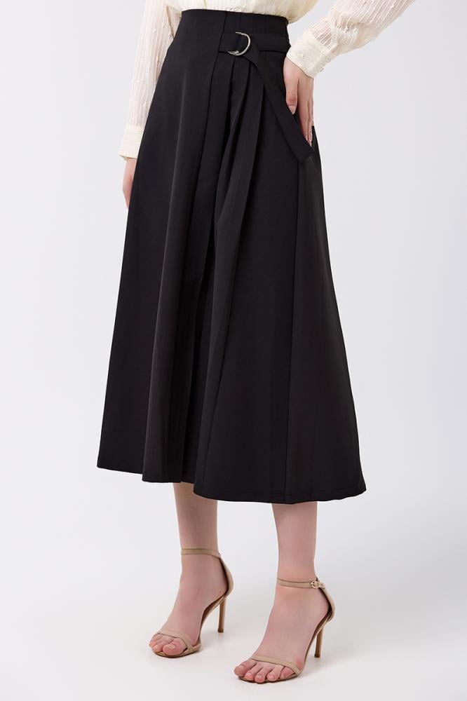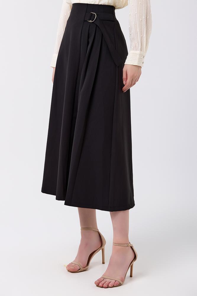 تنورة كريب اسود مع حزام بحلقة جانبي وثنيات جانبية لقصة عصرية مميزة كلوش