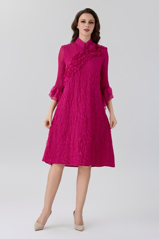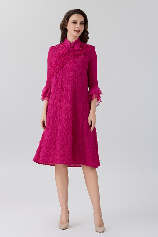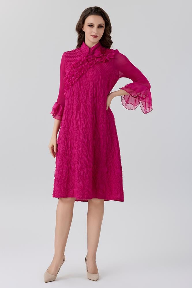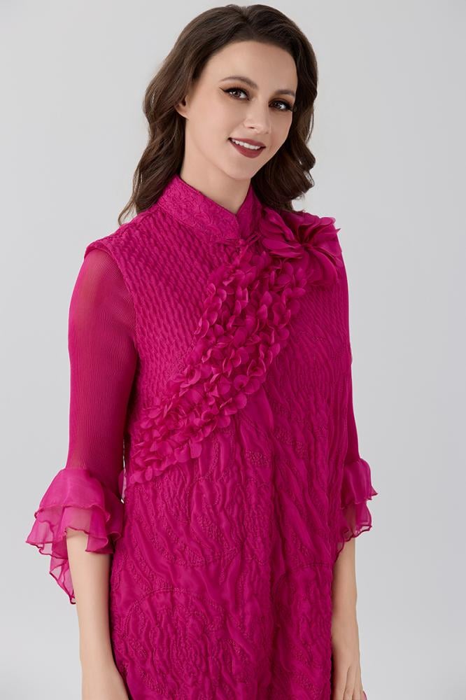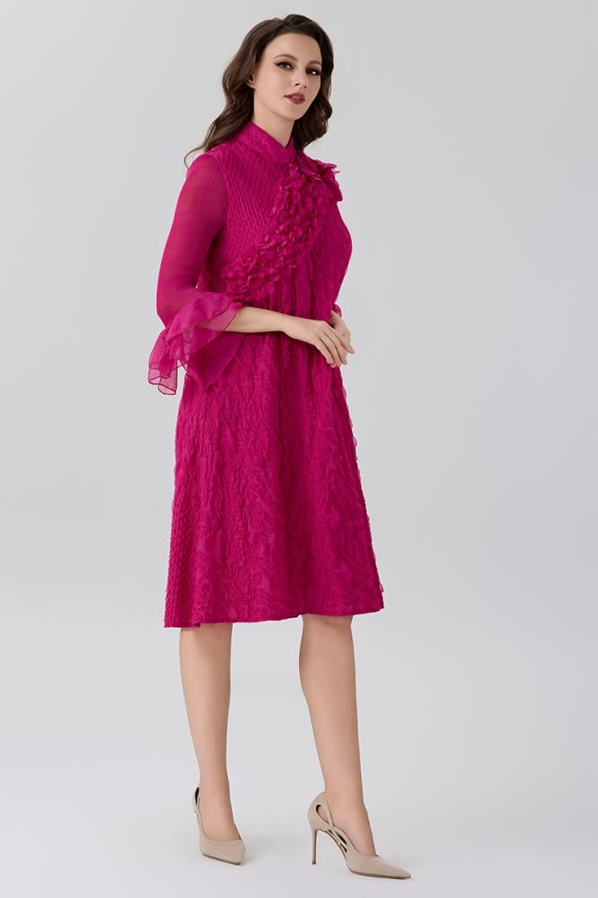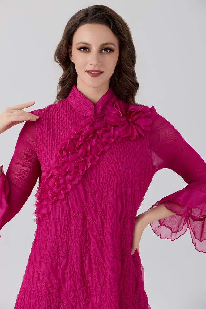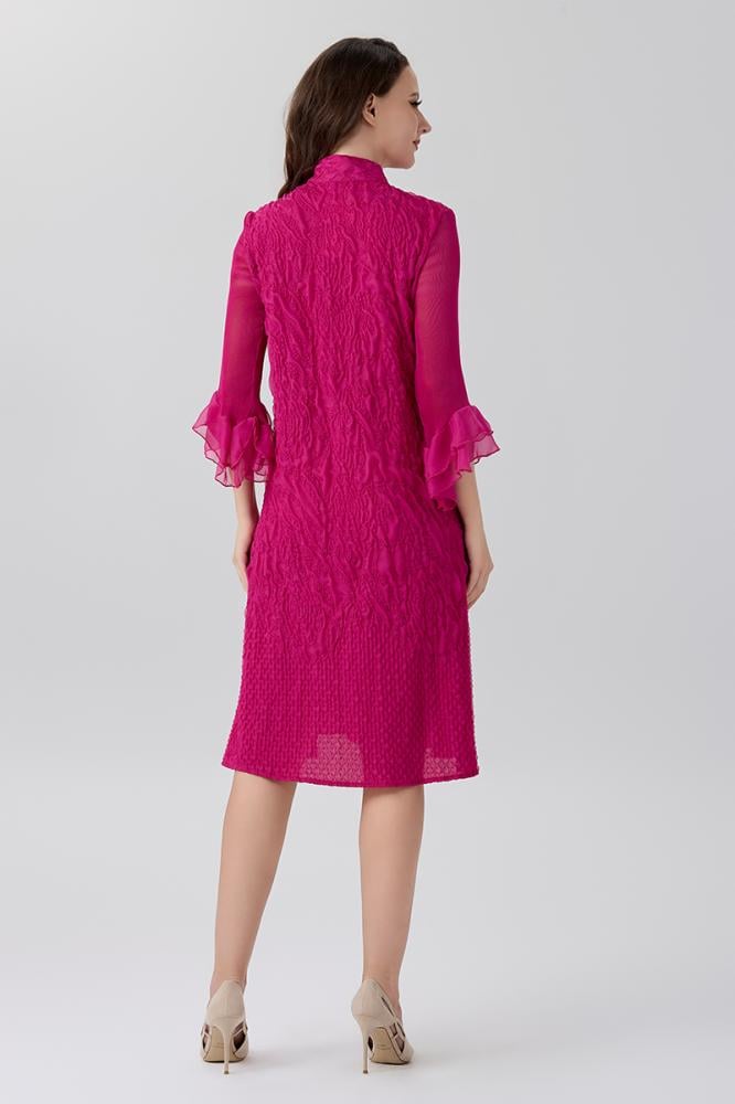 فستان فوشي فري سايز مع كشكش على اطراف الاكمام وعلى الصدر بطريقة مميزة